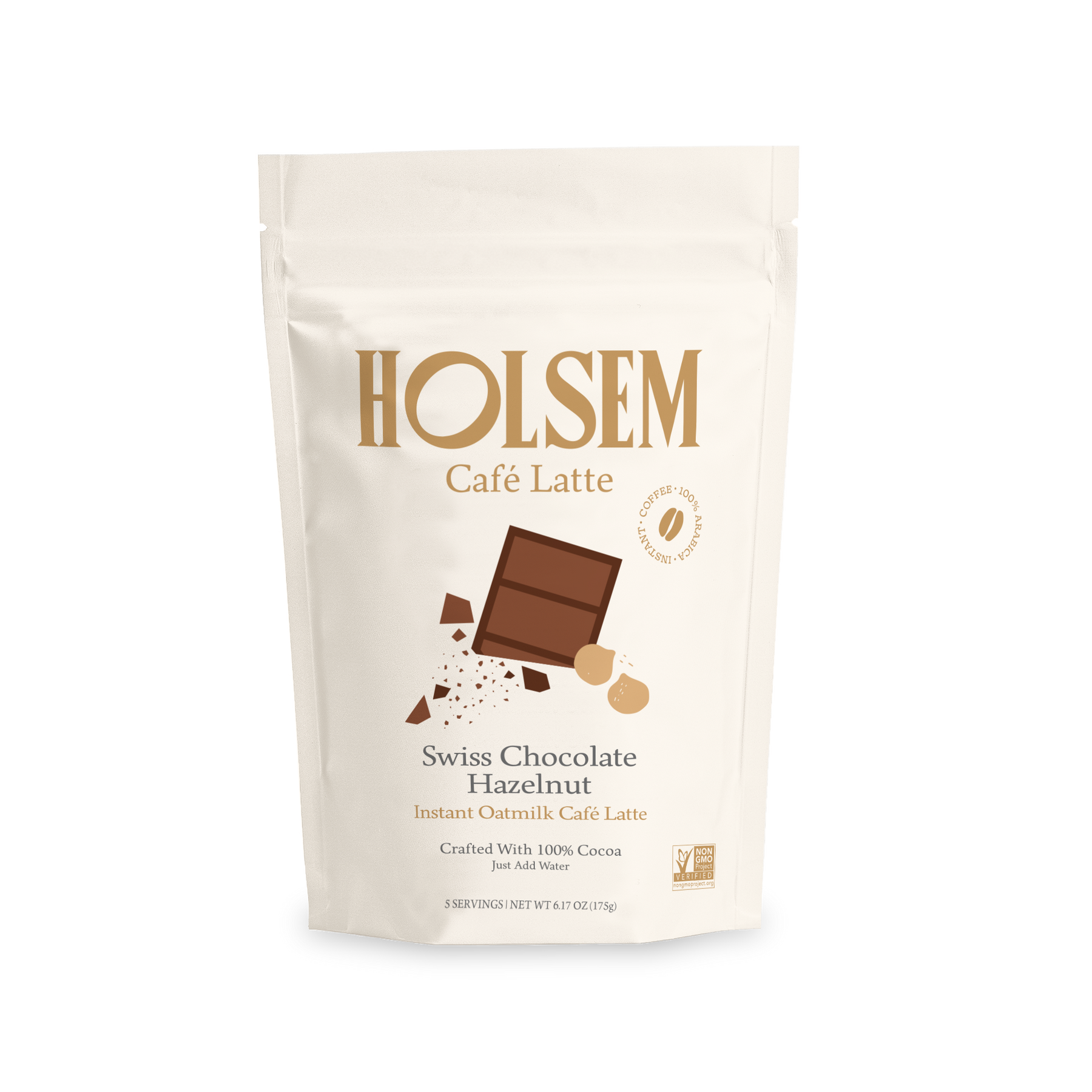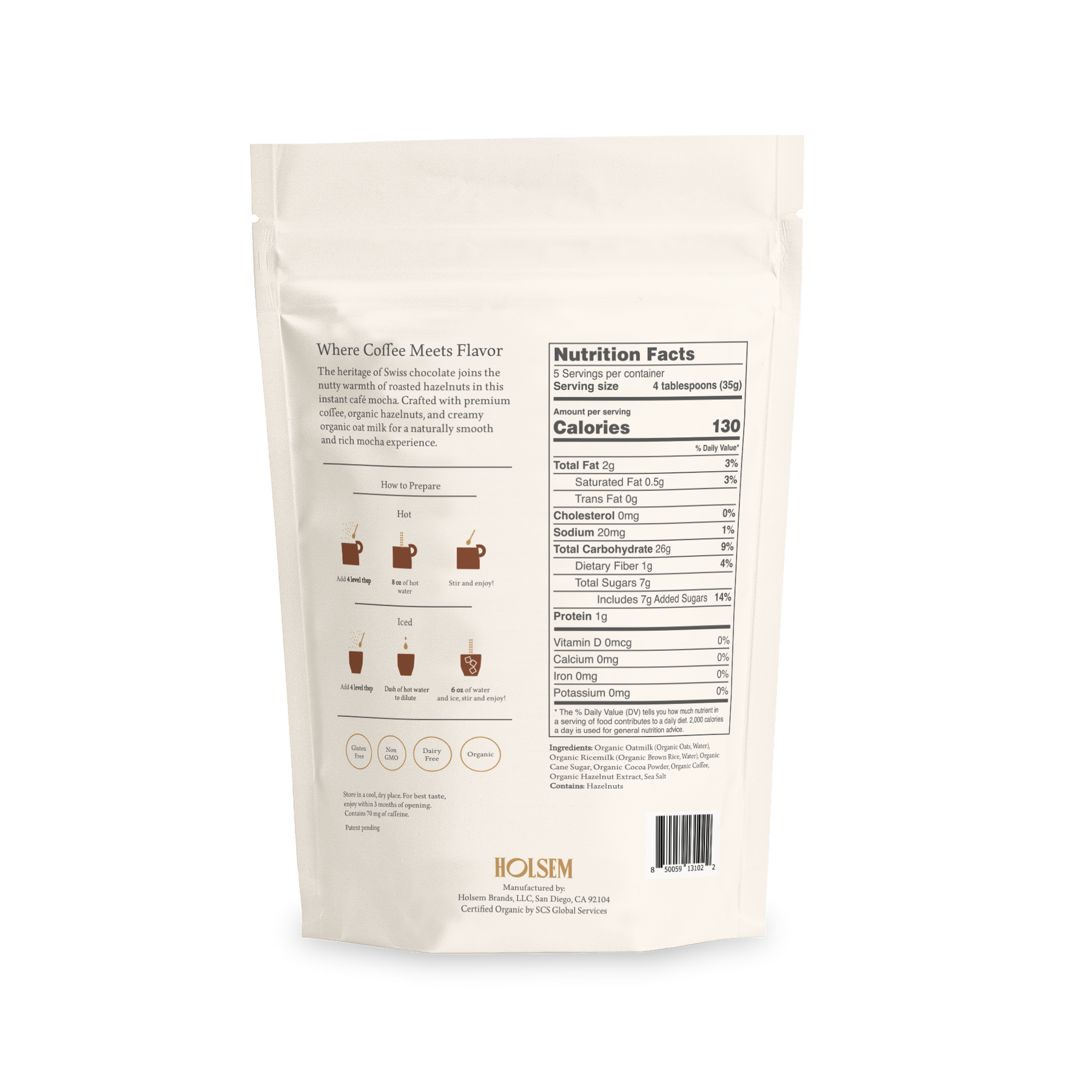 The heritage of Swiss chocolate joins the nutty warmth of roasted hazelnuts in this instant cafe mocha. Crafted with premium coffee, 100% cocoa, and creamy organic oat milk for a naturally smooth and rich mocha experience. Shelf-stable and easy to prepare — just add hot water. Made with organic ingredients. Dairy free, gluten-free, and non-GMO.